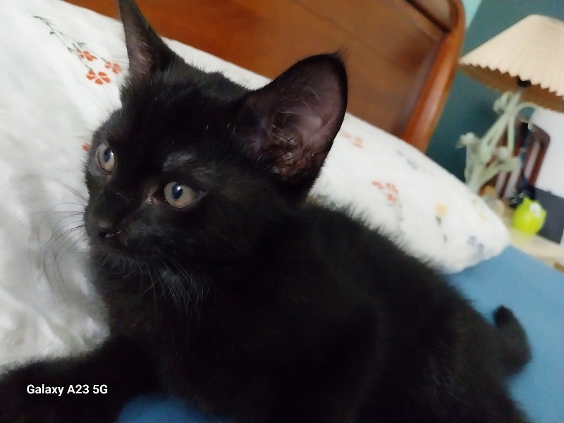 Bonjour, je m'appelle AMANI, issu de la fratrie des 4 bébés dit "bébés Batman". Je suis un chaton mâle, né le 18 avril 2025, mon pelage tout doux est noir brillant, il fait ressortir mes beaux yeux verts.