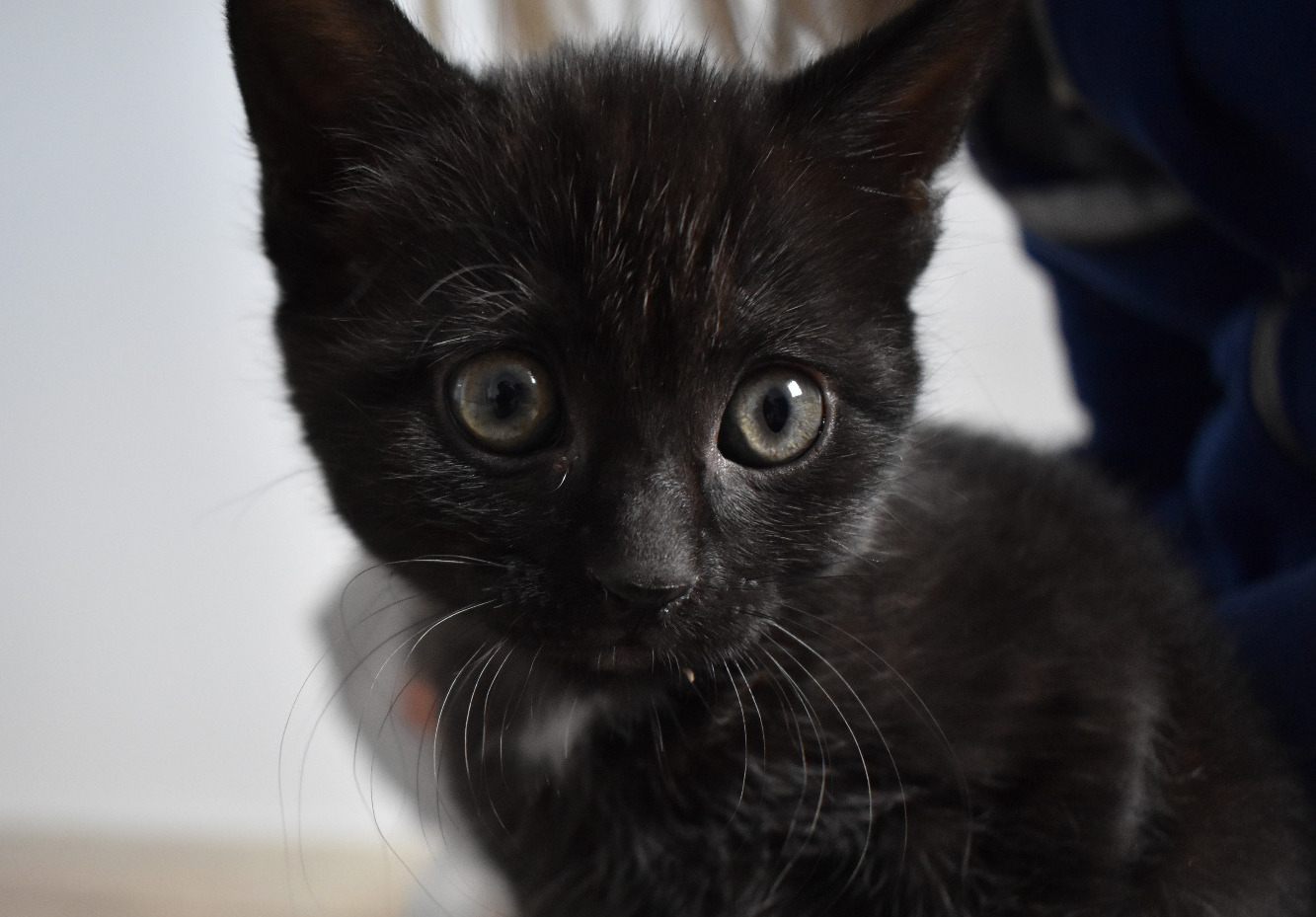 Samba, issue des Quintuplés, est une adorable petite chatte noire avec des poils blancs (déjà ;) !).