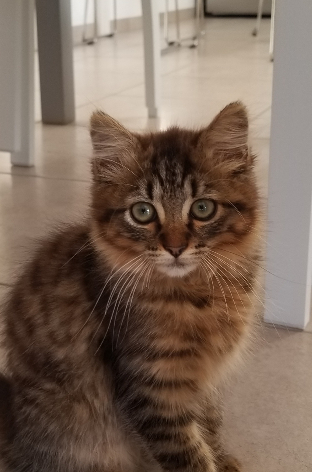SOBO, aux airs de petit lynx, est pourtant bien un chaton de 2 mois au pelage tigré et touffu.