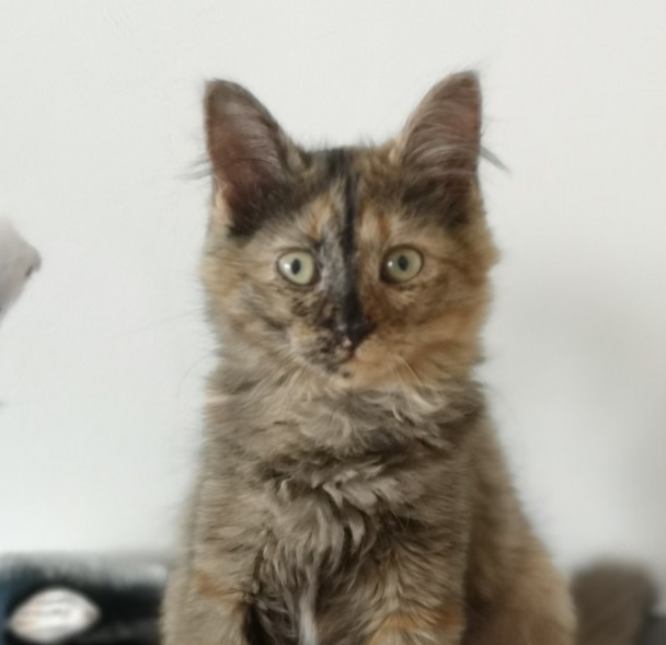SOOKIE, petite femelle née début juin, est la sœur de Sidonie, déjà à l'adoption. Elle possède une belle robe écaille de tortue à poils mi-longs et de beaux yeux verts remplis de douceur qui vous font littéralement craquer.