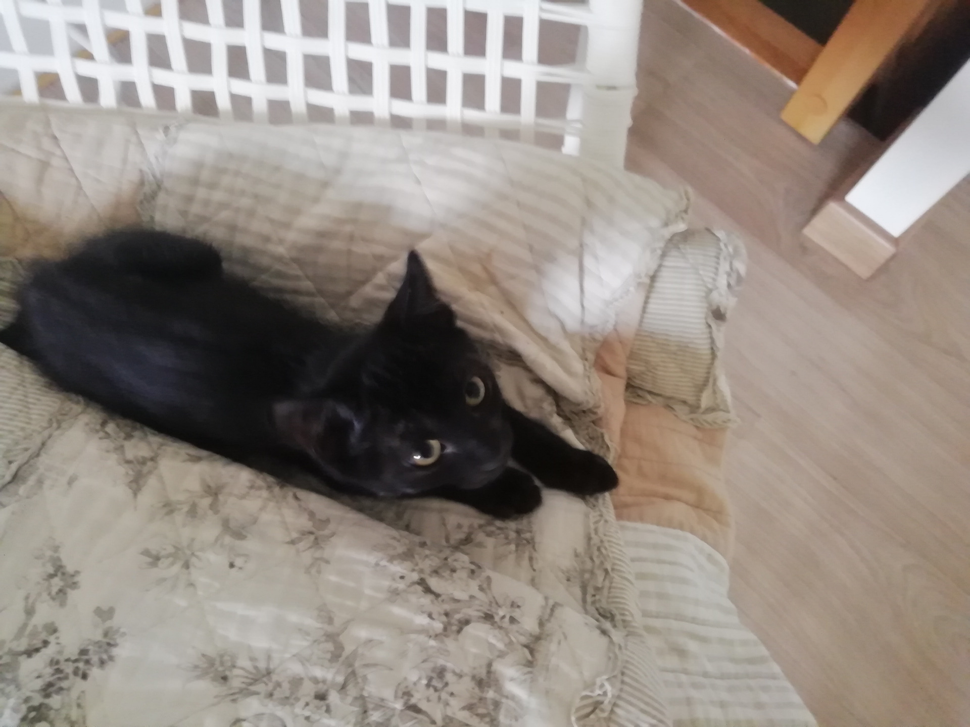 Tell est une petite minette de couleur noire avec quelques poils blancs sur le dos.