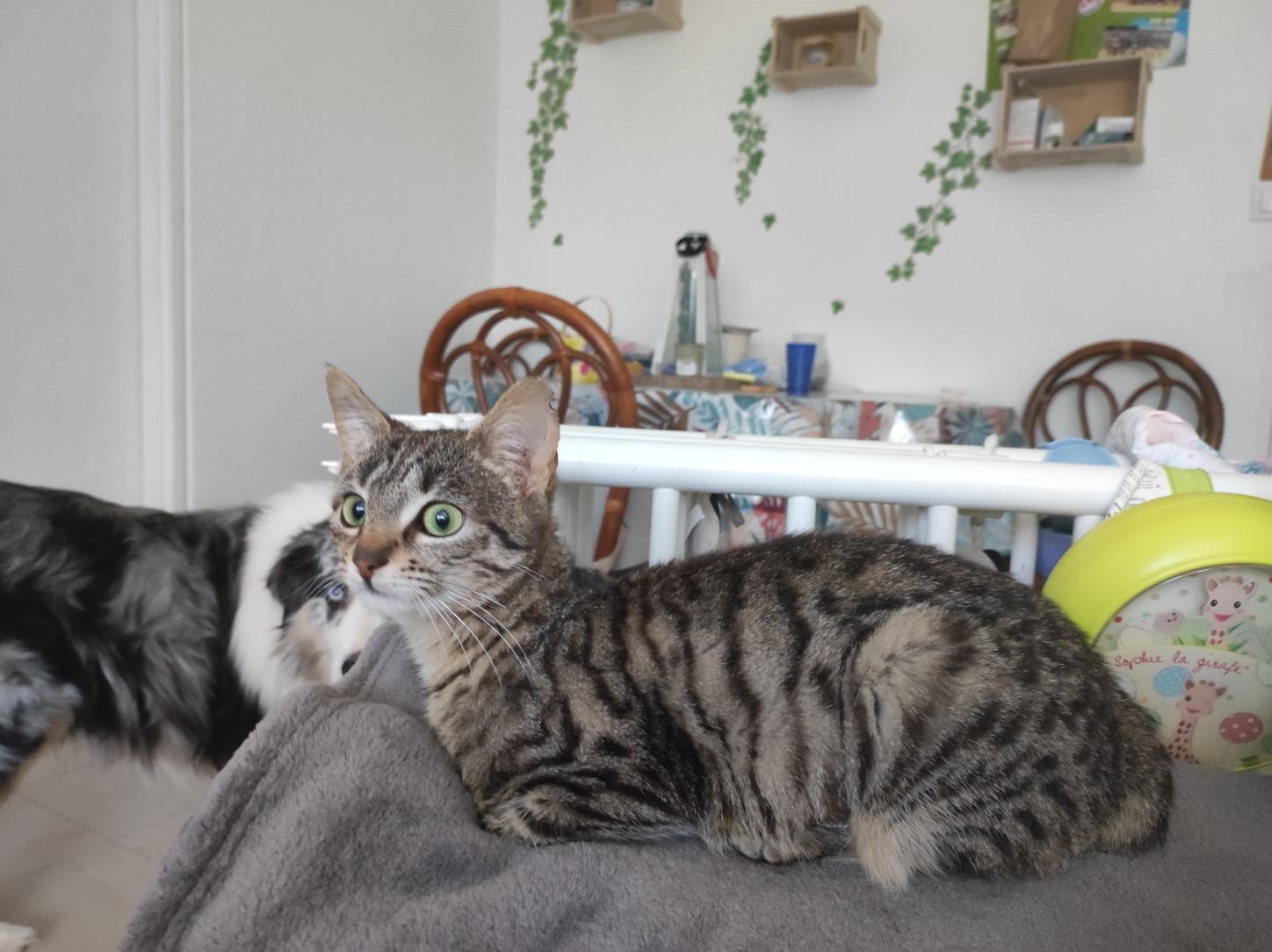Tita est une minette espiègle, câline, qui a des qualités de chien puisqu'elle suit les humains de partout. Un compagnon serait idéal pour elle qui a l'habitude des chiens, des chats et des enfants.