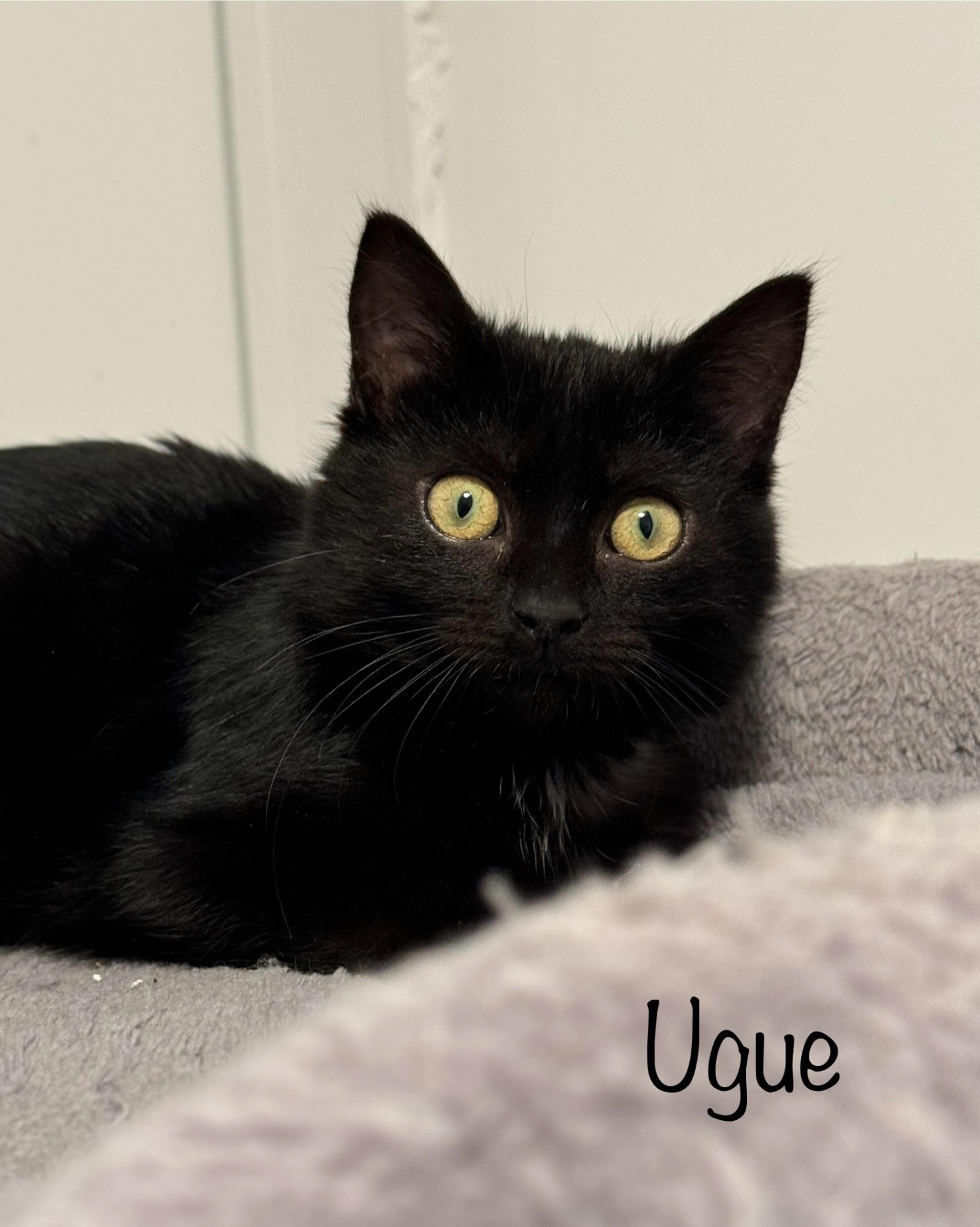 Bébé Ugue, assez timide au premier abord, est un petit chaton adorable, très calme et très câlin. Il demande beaucoup de présence et commence à ronronner dès qu'on lui fait une caresse. Il sait se faire comprendre quand il veut de la compagnie et nous appelle de son doux petit miaulement.