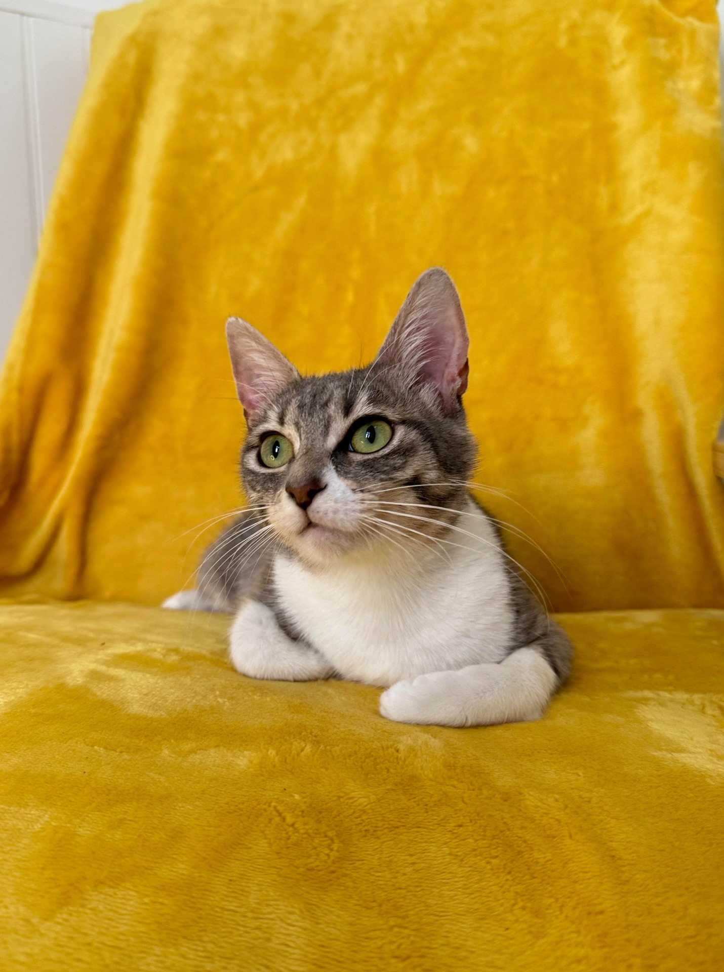 Victoire est une jeune chatonne grise et blanche aux yeux verts magnifiques.