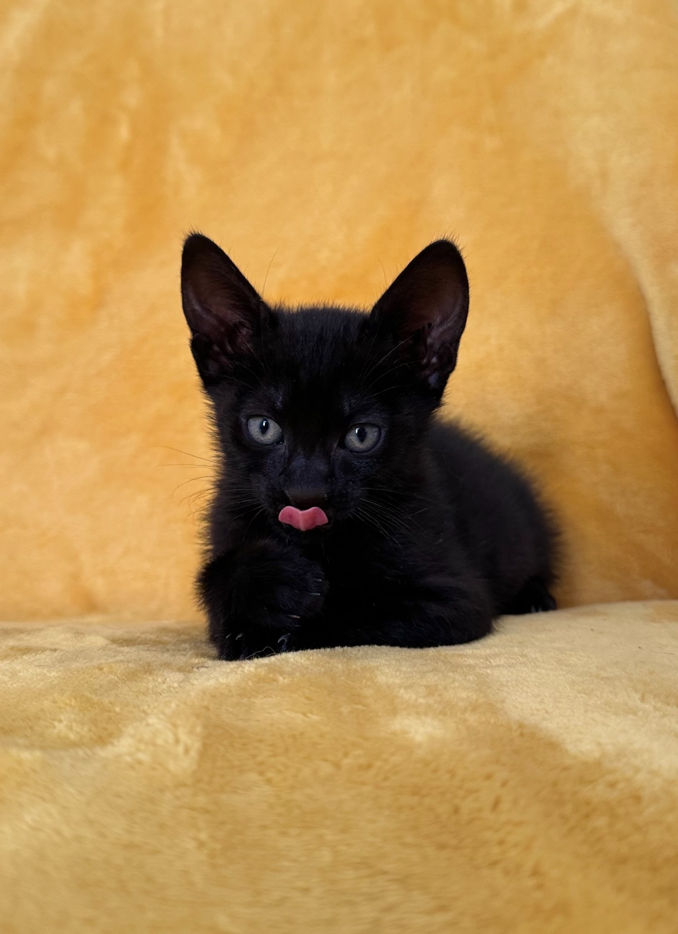 Velours est un chaton mâle tout noir, il a eu la chance d'avoir été élevé par sa maman, avec son frère Verdi.