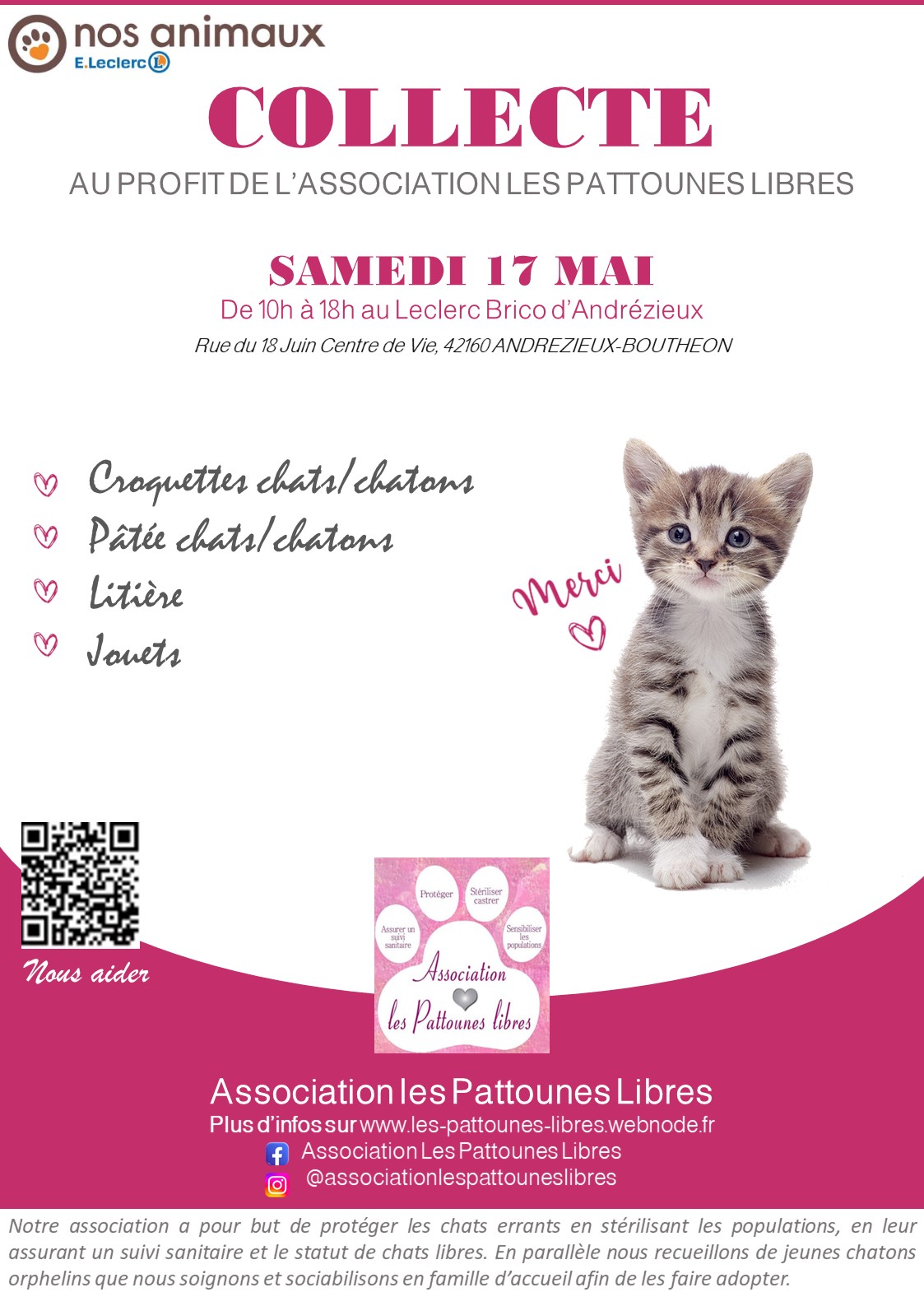 Le samedi 17 mai 2025 de 10h00 à 18h00, nous serons chez BRICO LECLERC, à ANDREZIEUX, pour recueillir vos dons de croquettes et pâtées, pour nos sites de nourrissage ; mais aussi vos dons de litière et divers matériel (bac litière, caisse transport, jeux...) pour nos familles d'accueil, qui sont bénévoles et qui prennent déjà à leur charge de nombreux frais.
